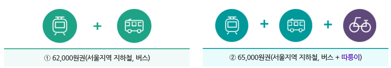 ◎ 월 65,000원 요금충전으로 30일간 대중교통(버스, 지하철), 따릉이를 무제한으로 이용이 가능한 정기권입니다.